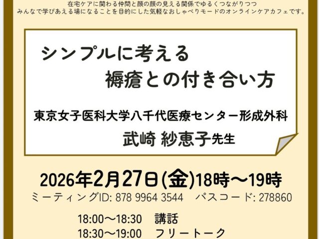 イベント 第35向日葵・カフェのお知らせ 第35回向日葵・カフェのお知らせです☕️テーマ:シンプルに考える褥瘡との付き合い方話題提供:東京女子医科大学八千代医療センター形成外科 武崎 紗恵子 先生日時:2026年2月27日(金)18時~19時 zoomにて対象:医療介護福祉の専門職... 2026.02.23 イベント研修案内